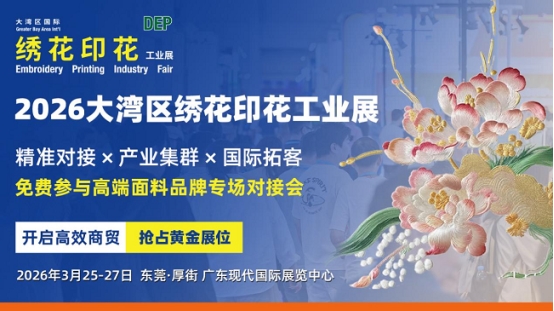 2026 大湾区国际绣花印花工业展(2026DEP)作为中国南方最具规模的“数码印花展会”、“纺织印花展会”、“刺绣绣花展会”。以 “新阶段、新理念、新格局” 为核心主题,将于 2026 年 3 月25—27日在东莞厚街广东现代国际展览中心重磅启幕,凭借与大湾区国际智能纺织制衣、鞋机鞋材工业设备展(...